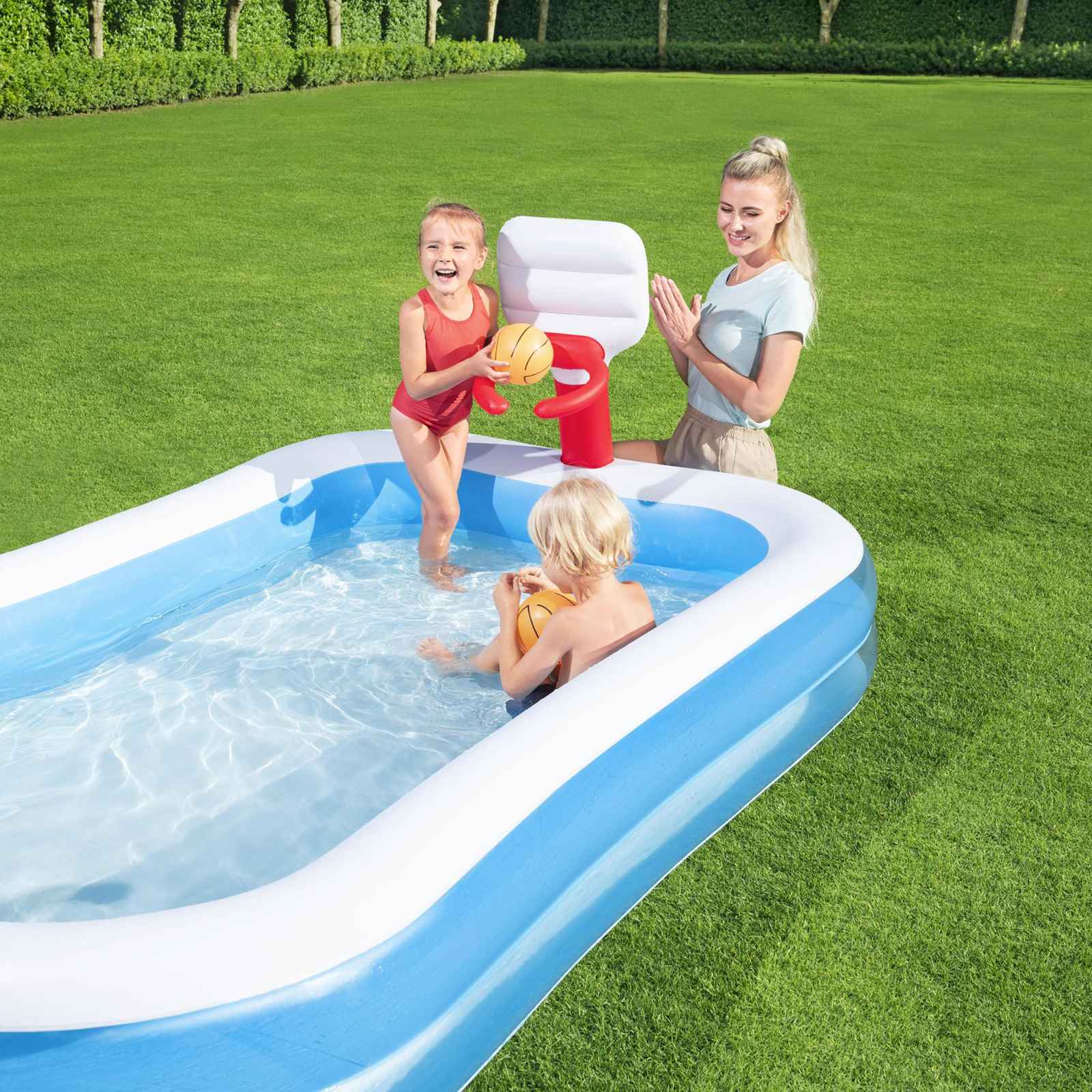 Con un set de baloncesto (con dos pelotas de baloncesto hinchables) y una piscina de juegos todo en uno,