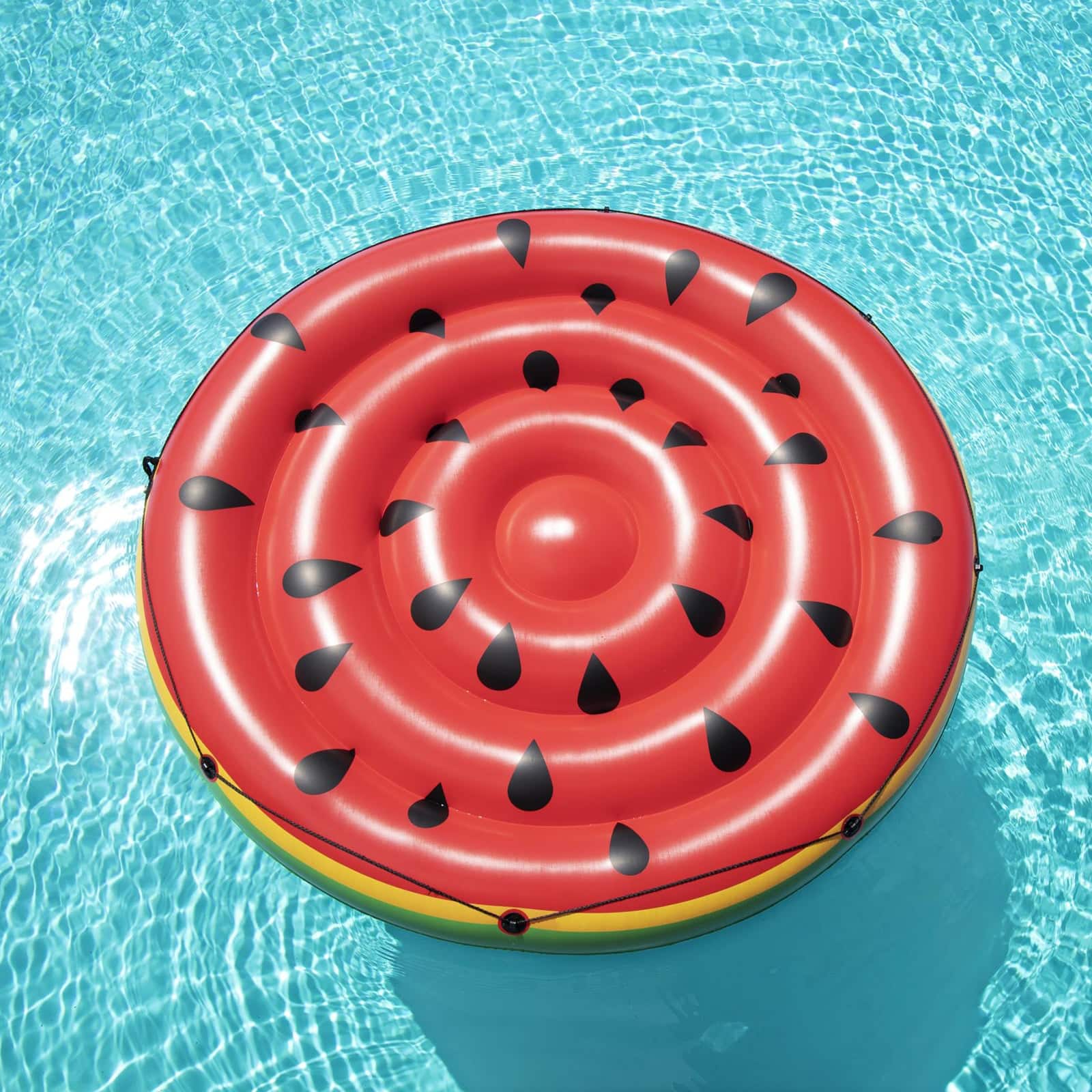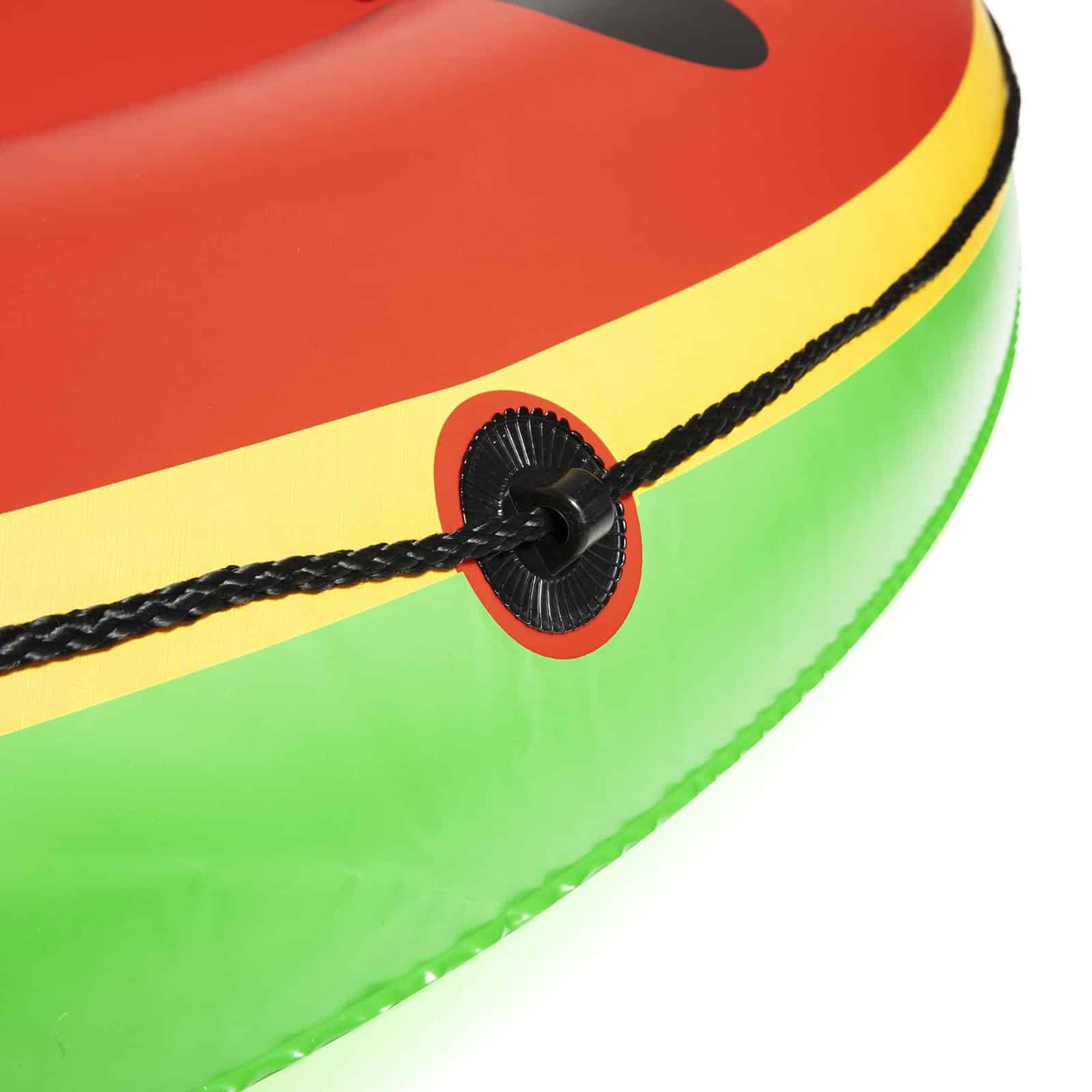 La Sandía Isla está hecha de vinilo robusto, probado previamente y tiene una cuerda de agarre versátil con arandelas incorporadas para que pueda saltar al agua y aferrarse al flotador para refrescarse. ¡Salpicar bajo el sol nunca ha sido tan divertido!
