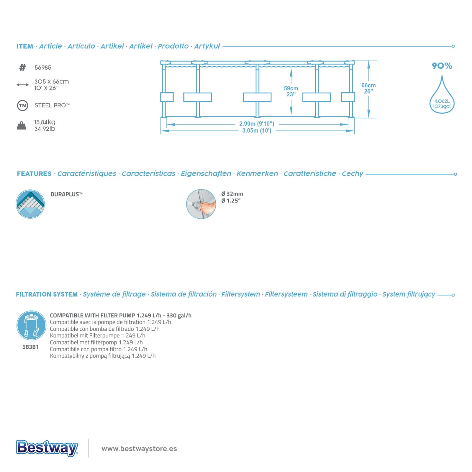 Fabricada con un resistente armazón metálico y un liner de triple capa DuraPlus™, esta piscina ofrece una gran resistencia frente a pinchazos y al desgaste propio del uso diario. Además, su estructura cuenta con el sistema FrameLink™, que garantiza una conexión firme y segura entre los tubos de acero, tratados contra la corrosión.