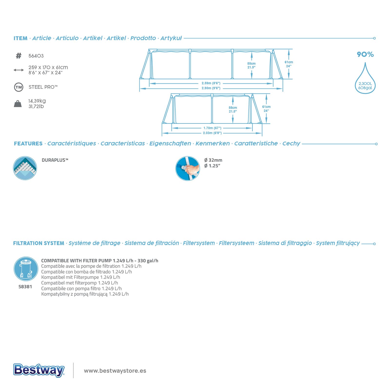 | Nombre | Piscina elevada Steel Pro de Bestway de 2.59 m x 1.70 m x 61 cm. | Bestway 2.87m * 2.01m * 1.0m Power Steel Rectangular Frame Pool Set | Conjunto de piscina circular sobre superficie Chapoteos a la sombra Steel Pro UV Careful de Bestway |