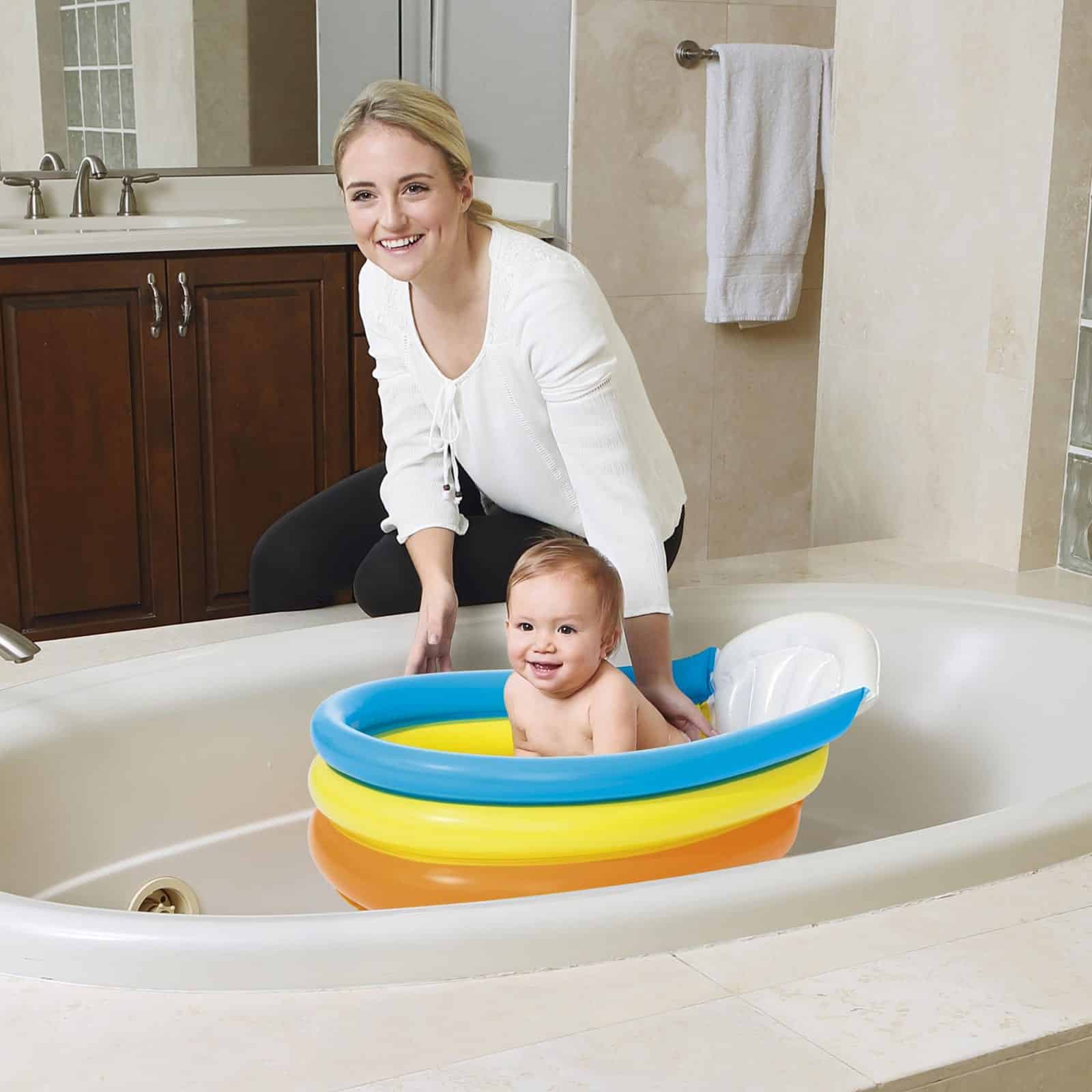 ¡La bañera hinchable para bebés Up In & Over™ Squeaky Clean hará que la hora del baño sea un momento lleno de diversión!