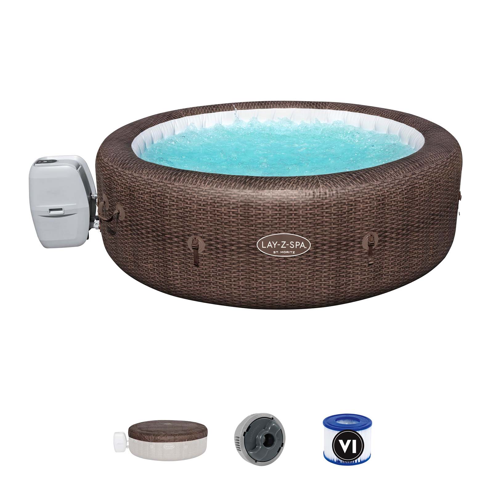 Contenido: 1 hidromasaje, 1 cubierta, 1 bomba, 1 dispensador ChemConnect™, 1 cartucho de filtro (de tipo VI), 1 parche de reparación.