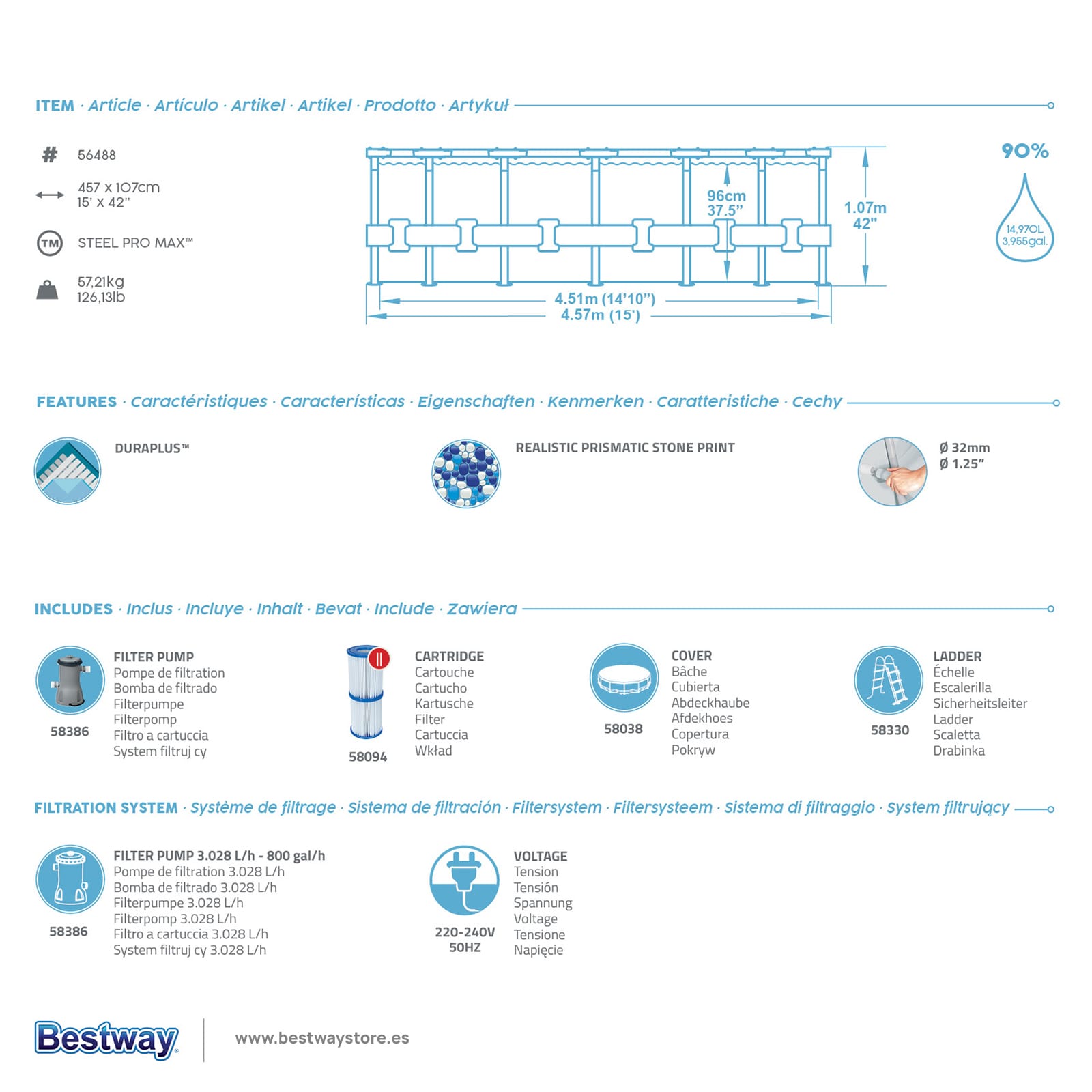 Contenido: 1 piscina, 1 bomba de filtrado (compatible con cartucho de filtro tipo II), 1 escalera, 1 cubierta de piscina.
