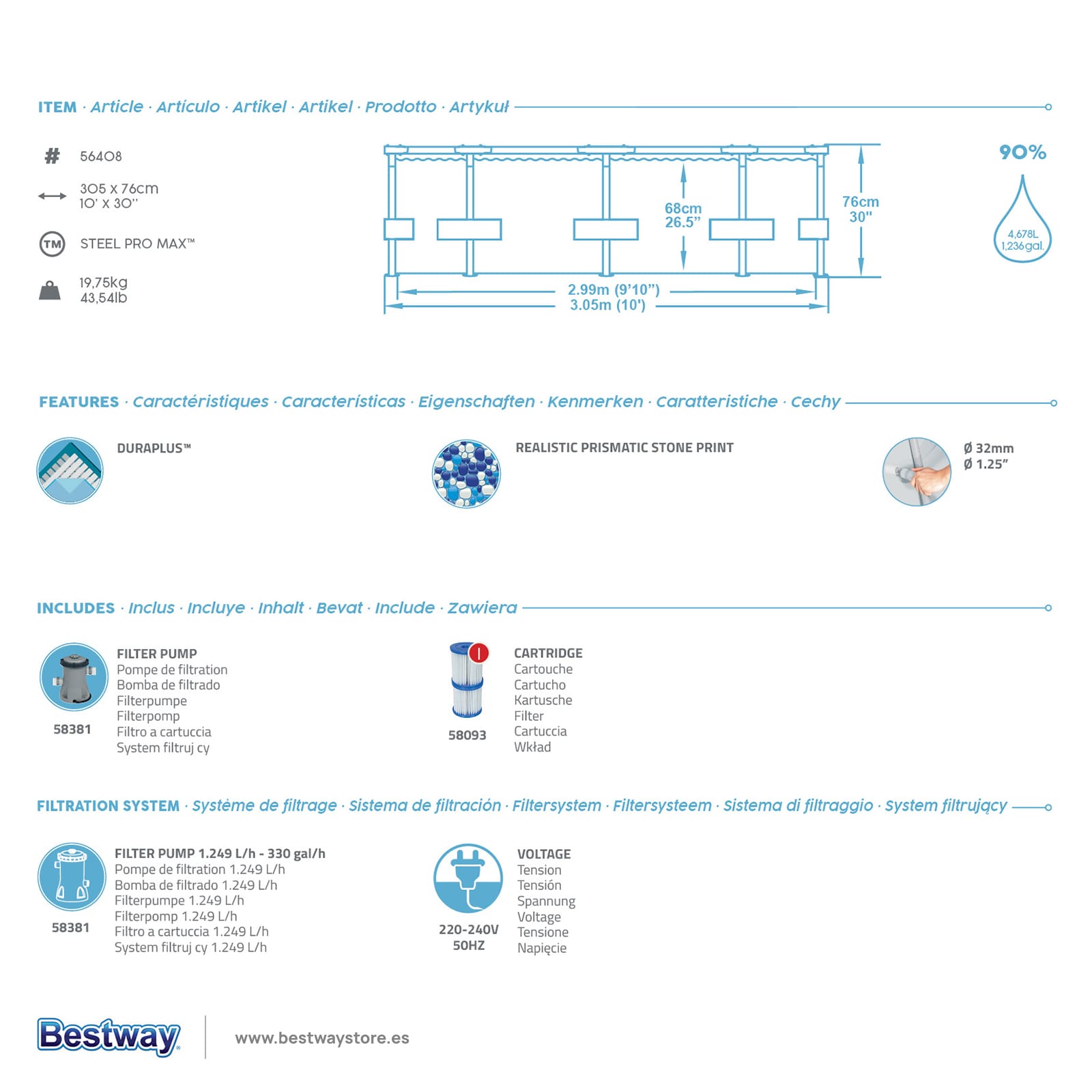 Bomba de filtrado de 1249 litros incluida.