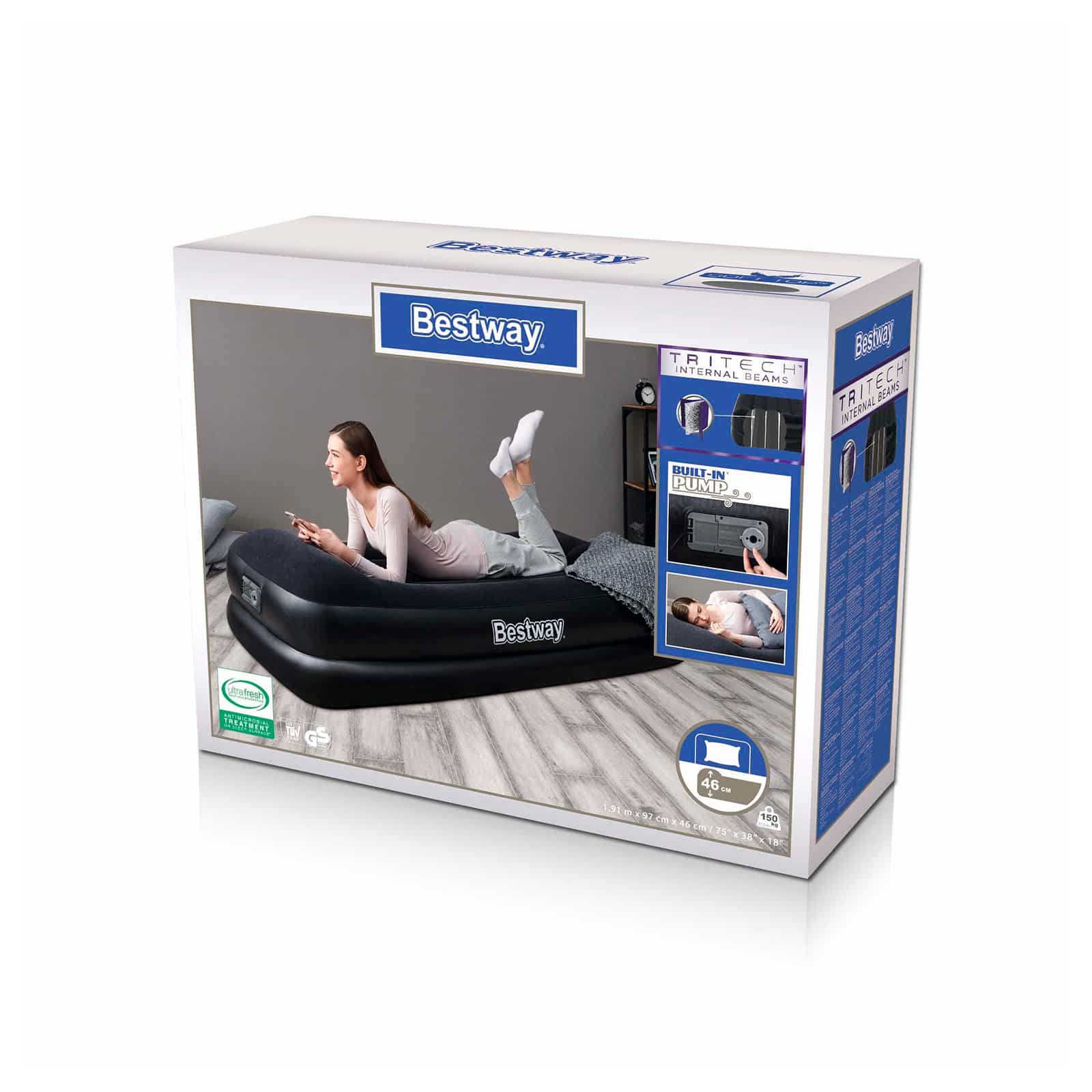 La bomba eléctrica CA (220-240 V) integrada permite inflar el colchón de forma rápida y sin esfuerzo en apenas 3 minutos. También se desinfla con rapidez gracias a su válvula de rosca, permitiendo una recogida limpia y cómoda.