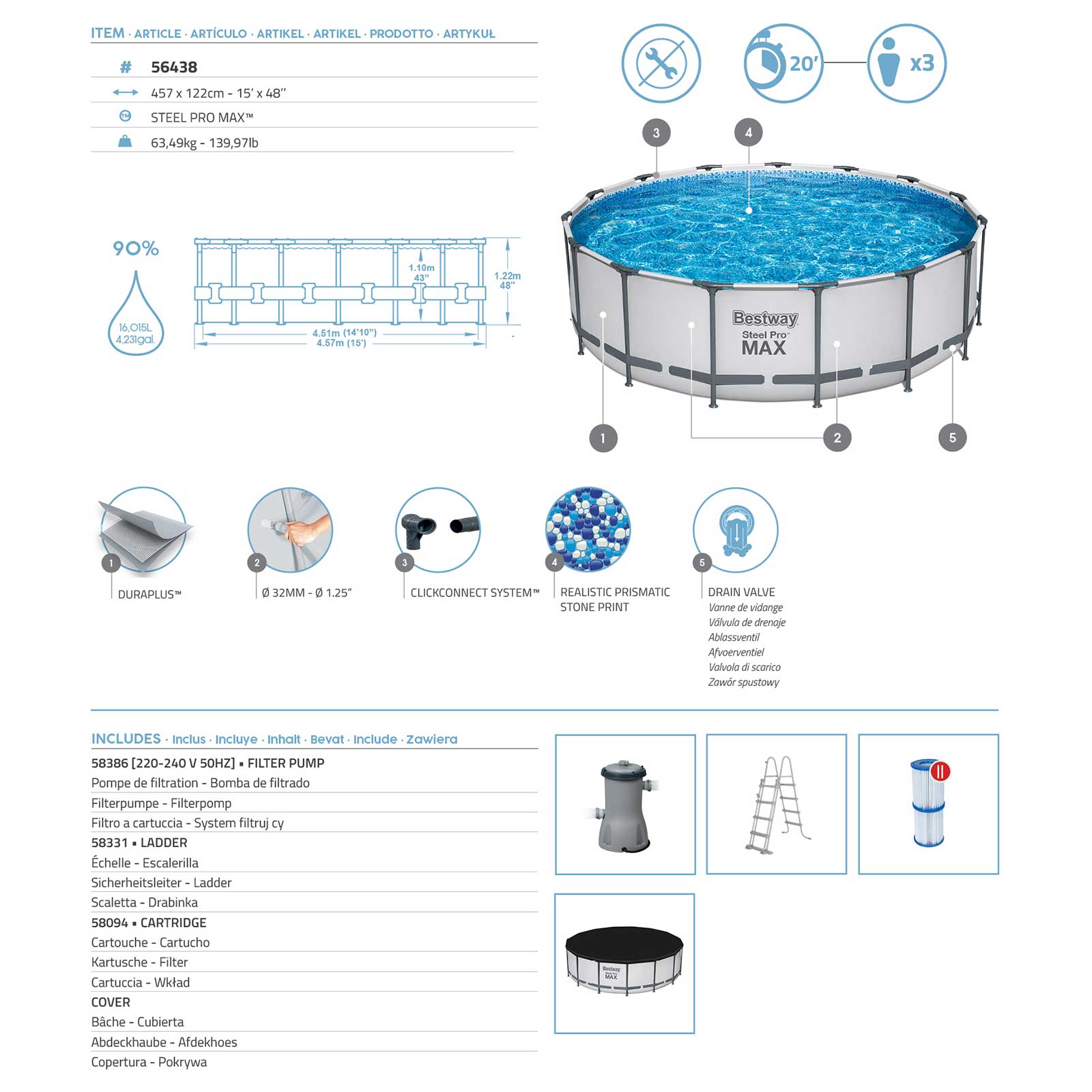 Contenido: 1 piscina, 1 depuradora de cartucho (compatible con cartucho tipo II) 1 escalera, 1 cobertor de piscina.