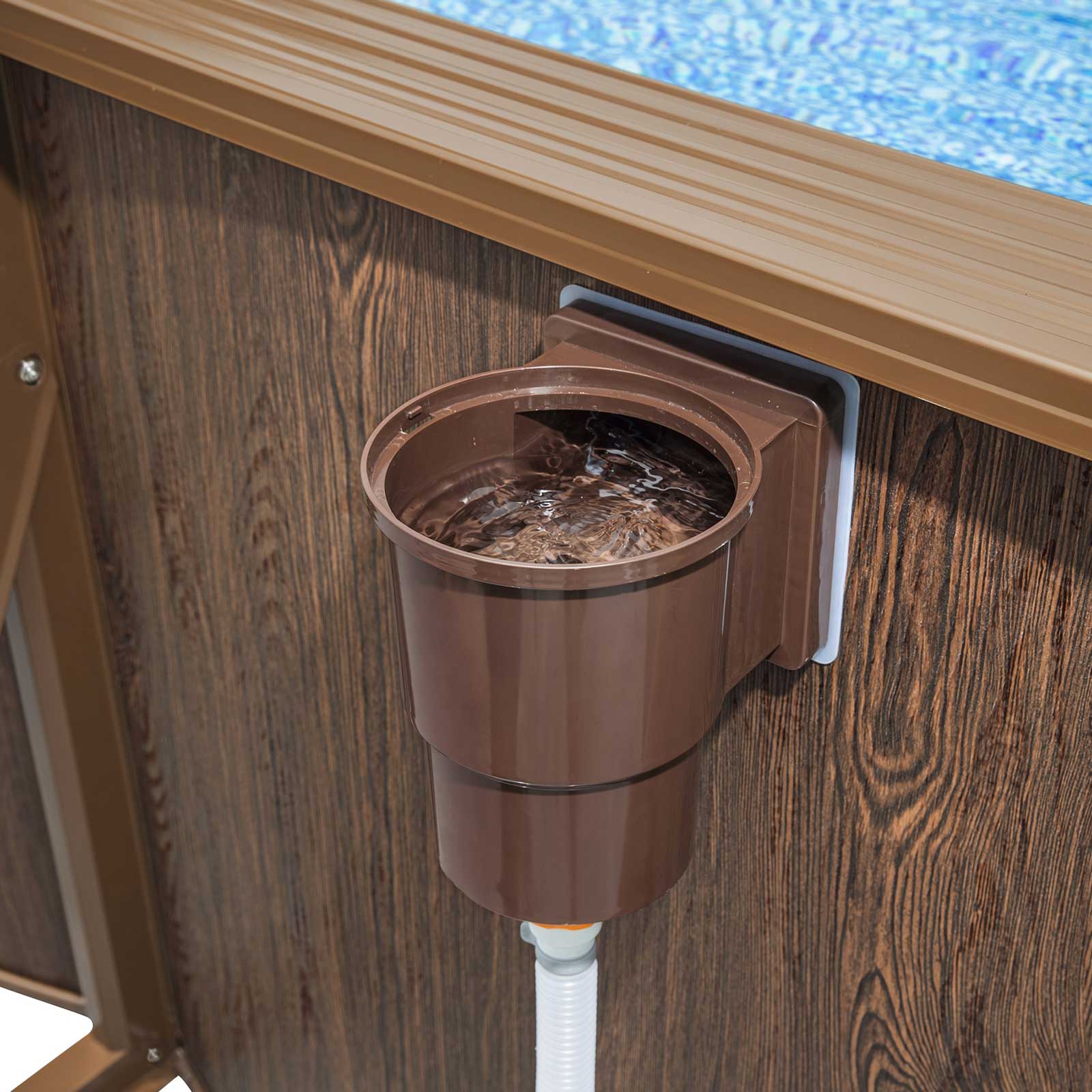 Cuenta con Realistic Prismatic Stone™. Un revestimiento exterior muy realista que simula ser una pared de madera veteada, mientras que por dentro tiene un fondo de piscina azul intenso.
