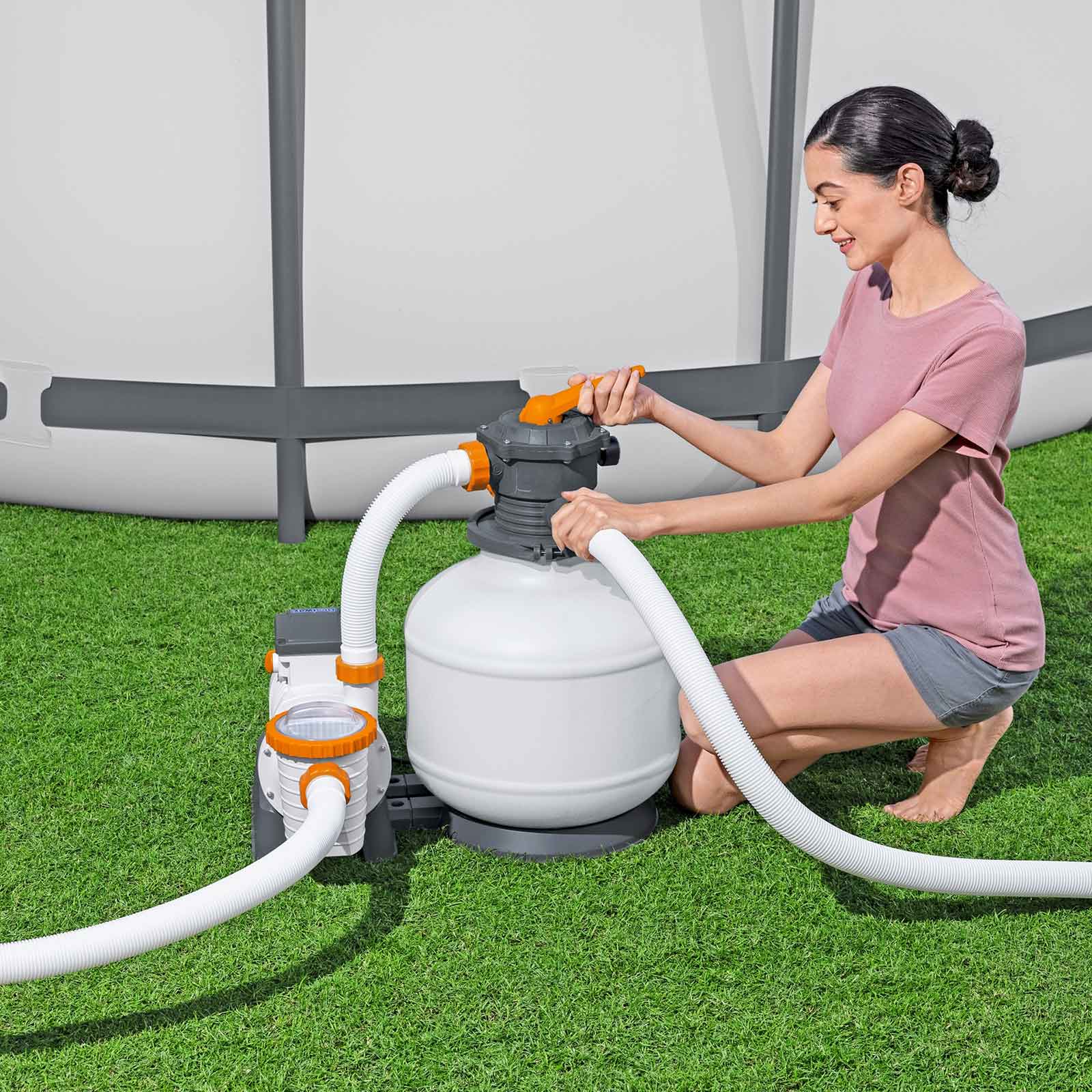 Presume de agua limpia y cristalina durante todo el verano con la depuradora de arena para piscina Flowclear™. La decisión más ecológica para el agua de tu piscina porque funciona con un depósito de arena de sílice por el que pasa el agua, filtrando toda la suciedad y dejándola perfecta para el baño sin generar residuos contaminantes.