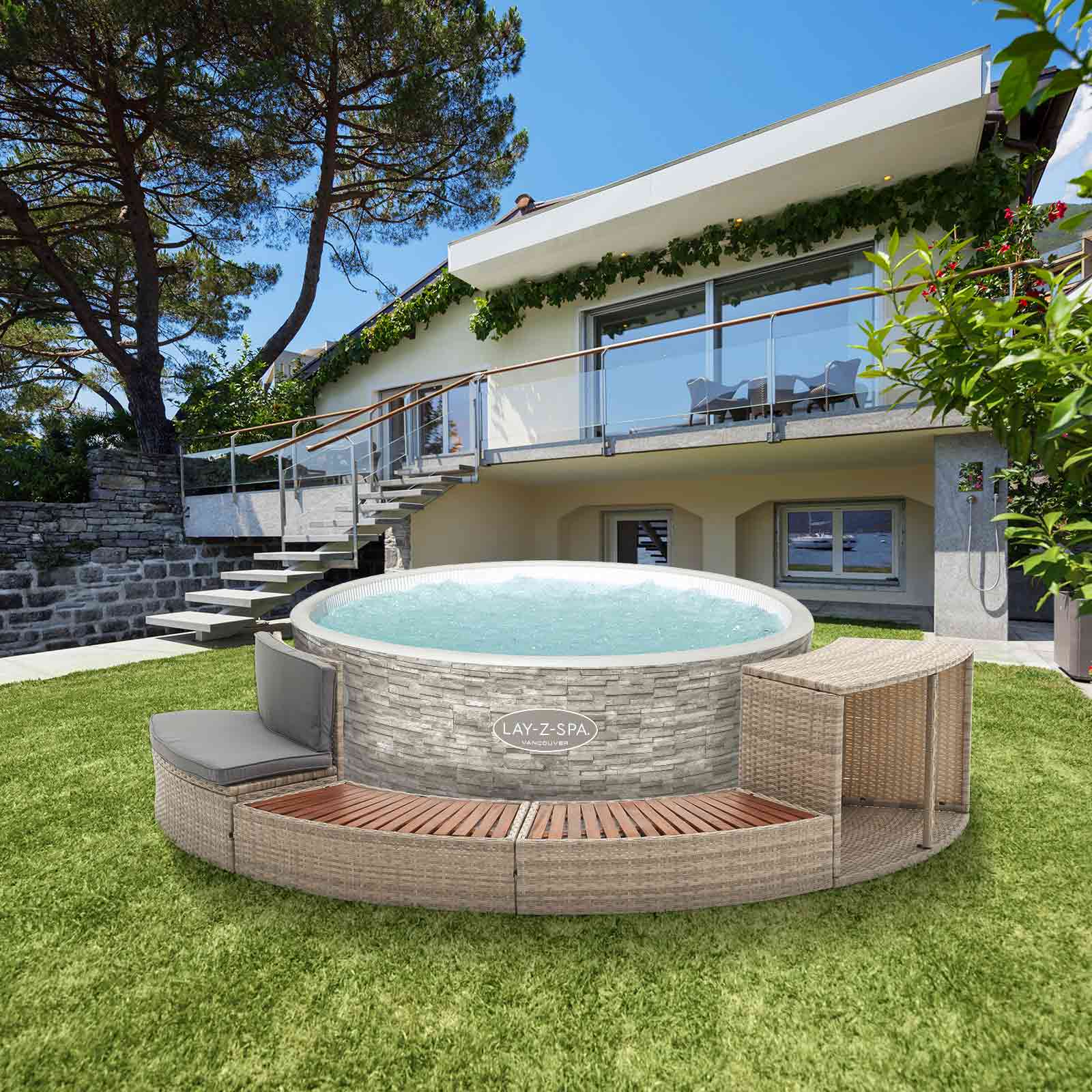 El revestimiento Spa Hidromasaje “Half Surround 180” es una solución excelente para bordear los spas de 180 cm de diámetro hasta su mitad como el modelo Lay-Z-Spa® Vancouver AirJet Plus™