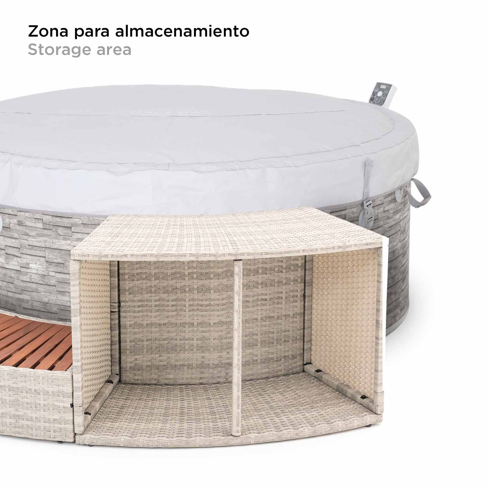 ¿Lo mejor? Son muy fáciles de montar y no necesitas hacer obra. Descansa en su banco entre cojines antes de sumergirte de nuevo entre burbujas, su escalón te va a permitir el acceso al spa con más facilidad. Además, posee una zona pensada para guardar tus cosas. Su recubrimiento de fibras natural es resistente a la lluvia y, por supuesto, a las altas y bajas temperaturas. Lo que permite que su uso en el exterior sea siempre excelente.