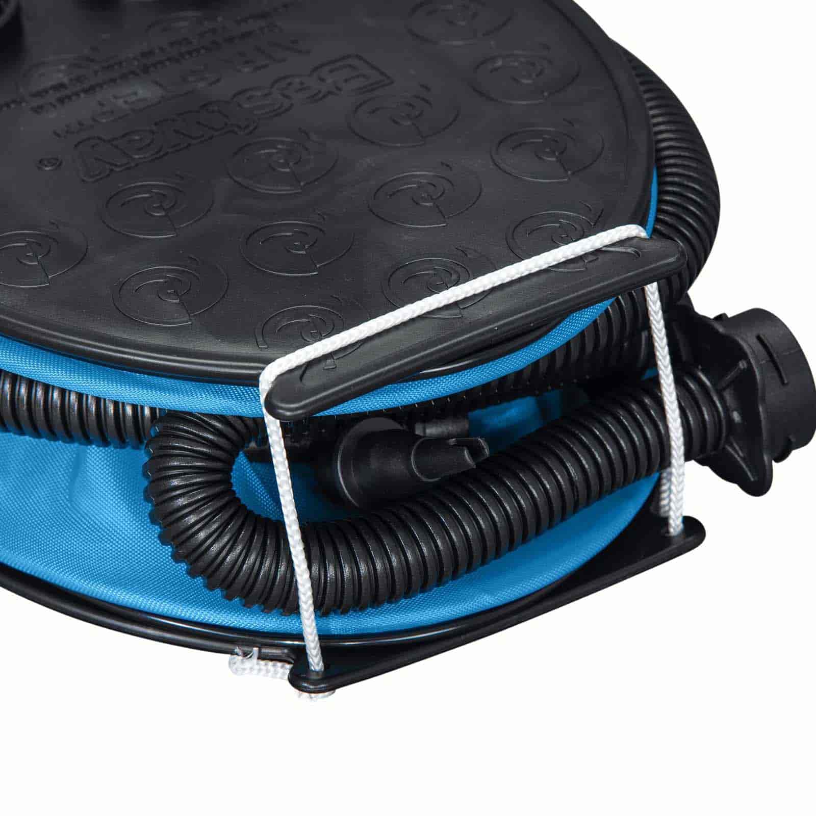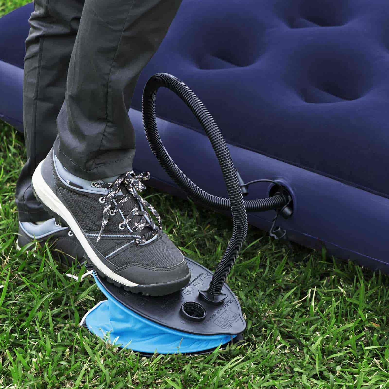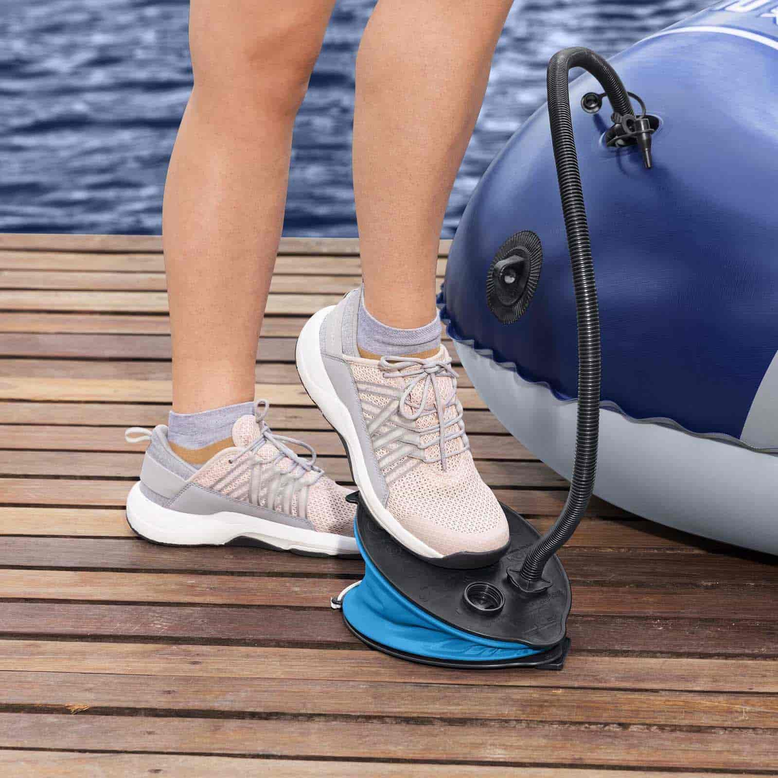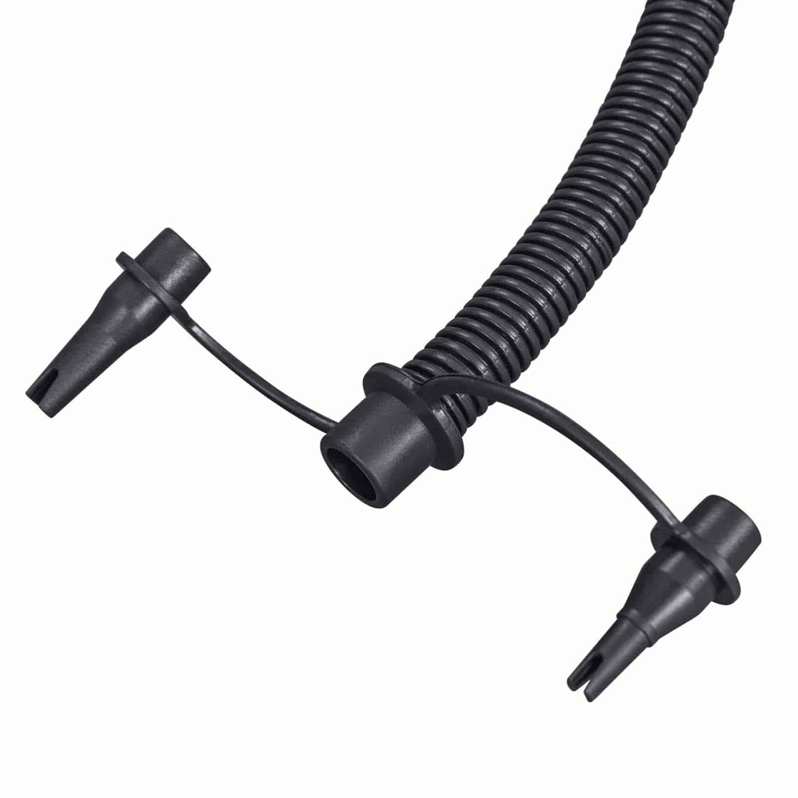 Volumen de bombeo de 0,8 L/ciclo. Cámara de aire amplia rápido inflado. Manguera flexible. Con cambio fácil de inflado a desinflado. 3 adaptadores de válvula para usar con diferentes productos inflables.