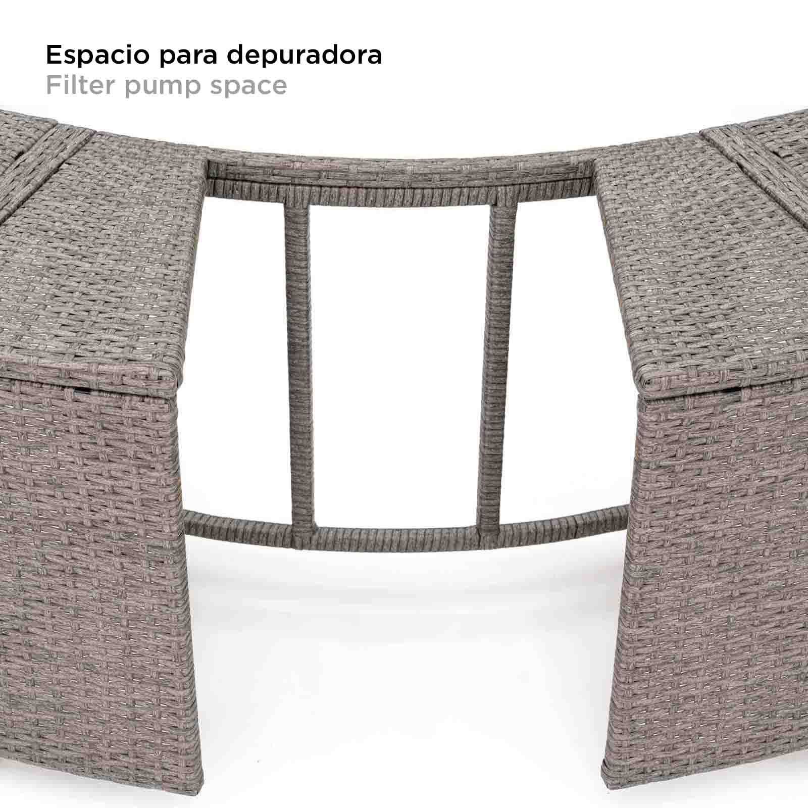 El acabado de este revestimiento integra dos cómodos asientos, un armario de doble hoja ideal para guardar tus objetos personales y un amplio escalón que facilita el acceso al interior del spa.