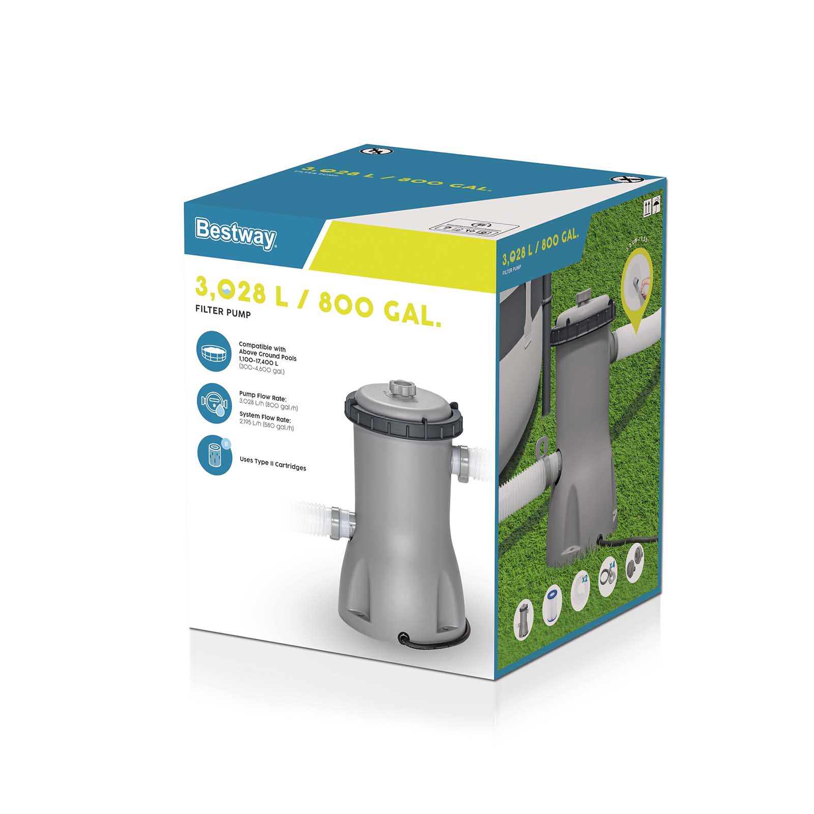 Está pensada para piscinas desmontables de entre 1.100 y 17.400 litros, y funciona con cartuchos de filtrado Tipo II, fáciles de instalar y de sustituir.