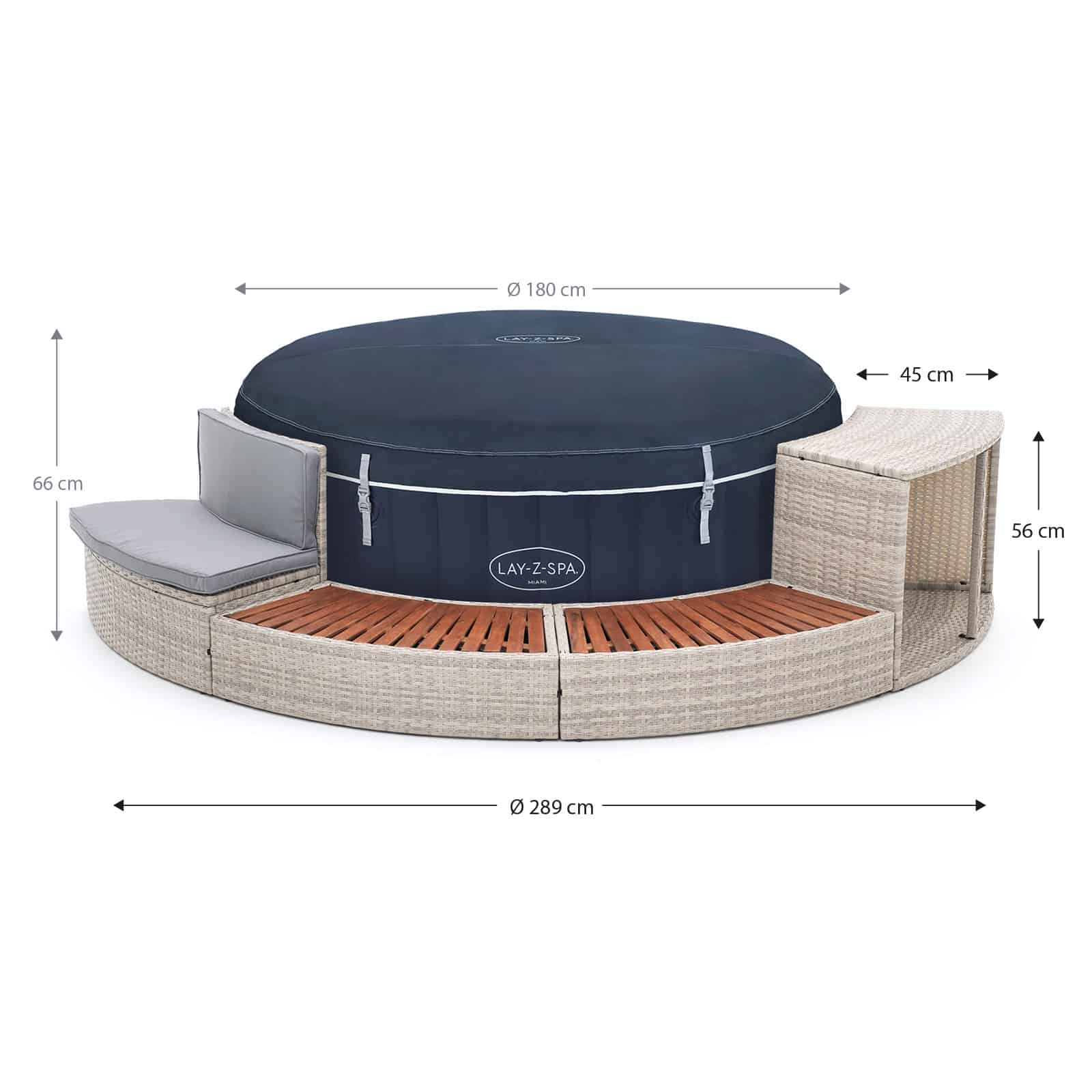 El revestimiento “Half Surround 180” es la forma perfecta de darle un extra de estilo y funcionalidad a tu spa de 180 cm de diámetro, como el Lay-Z-Spa® Miami AirJet™.