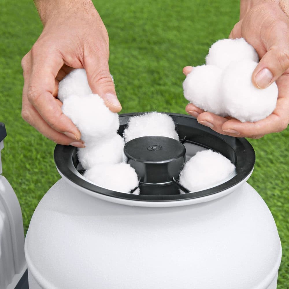 Las poliesferas de filtro son una innovación tecnológica en el tratamiento del agua de piscinas. Parecen bolas de algodón, pero están fabricadas con fibra de poliéster o polietileno reciclable y se utilizan en depuradoras de arena como sustituto directo de la arena de sílice. Lo mejor es que pueden usarse en todas las depuradoras de arena de Bestway.